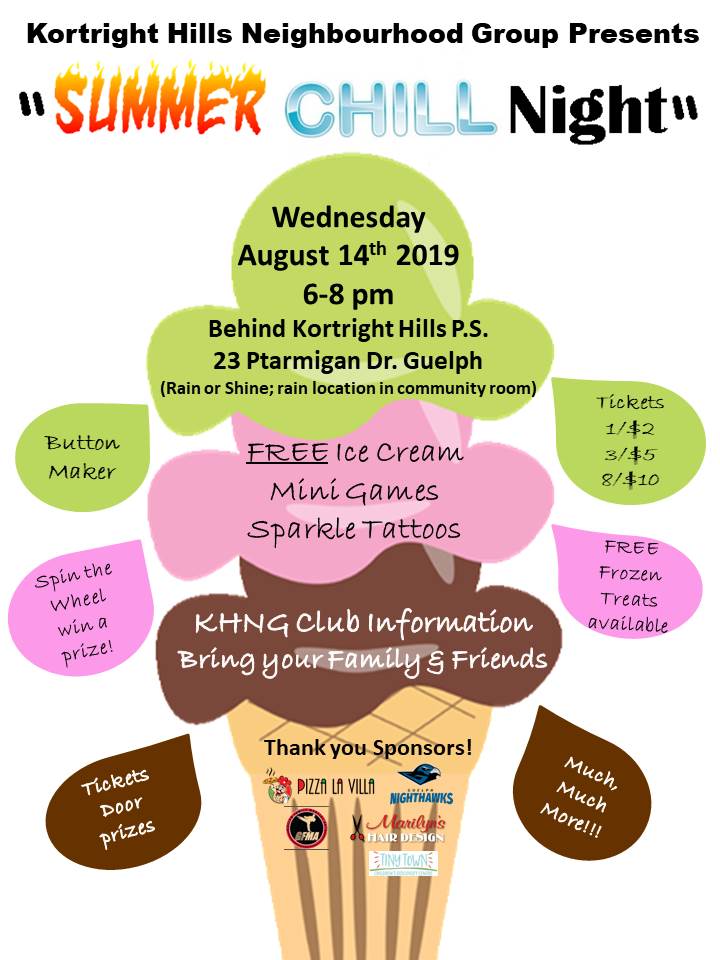 Event Details: Kortright Hills Neighbourhood Group is holding our 7th Annual “Summer Chill Night” and invites the community to join us Wednesday August 14th between 6 PM and 8 PM behing Kortright Hills Public School 23 Ptarmigan Dr. Guelph. This event will run rain or shine. Rain location KHNG Community Room