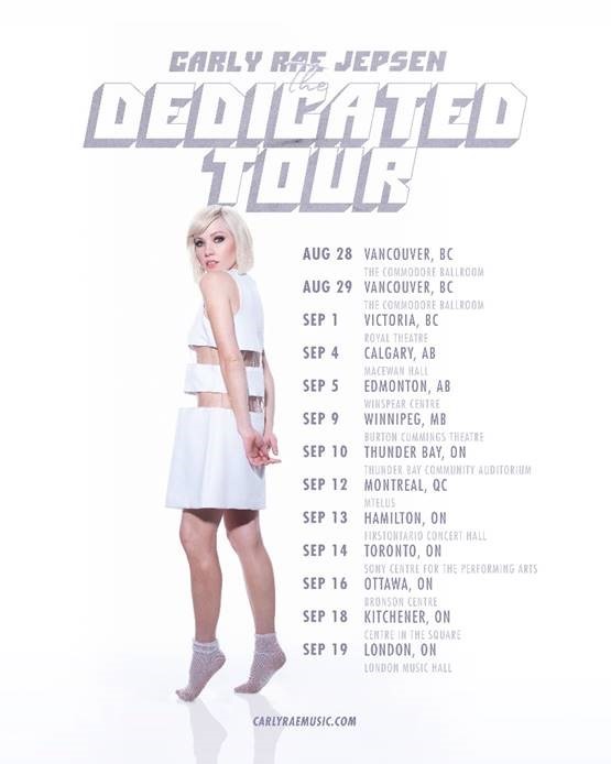 | Today, Multi-platinum GRAMMY, JUNO Award and Polaris Prize nominated singer/songwriter Carly Rae Jepsen announces her Dedicated Canadian tour dates. Kicking off August 28, 2019 in Vancouver, BC the tour will hit 12 cities wrapping September 19, 2019 in London, ON.