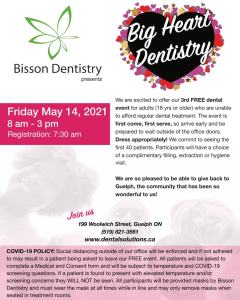 Big Heart Dentistry Where Bisson Dental, 199 Woolwich Street, Guelph, Ontario Map When May 14/21 08:00 AM - May 14/21 03:00 PM Age 18+ Website dentalsolutions.ca