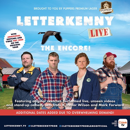Based on overwhelming demand, new shows and markets have been added to the 2018 “LETTERKENNY LIVE” tour – a 90-minute comedy experience, starring Jared Keeso (Wayne), Nathan Dales (Daryl), K Trevor Wilson (Dan), and Mark Forward (Coach), the stars of the wildly popular award-winning CraveTV original series LETTERKENNY. “LETTERKENNY LIVE, THE ENCORE!” tour, presented by Puppers Premium Lager and CraveTV, and produced by New Metric Media, will feature original sketches performed by the LETTERKENNY favourites, additional sketches and video not seen on the original tour, as well as original stand-up sets from Wilson and Mark Forward. The tour will make stops across Ontario, Saskatchewan, Alberta and British Columbia before wrapping at Vancouver’s legendary Orpheum Theatre on December 18th.